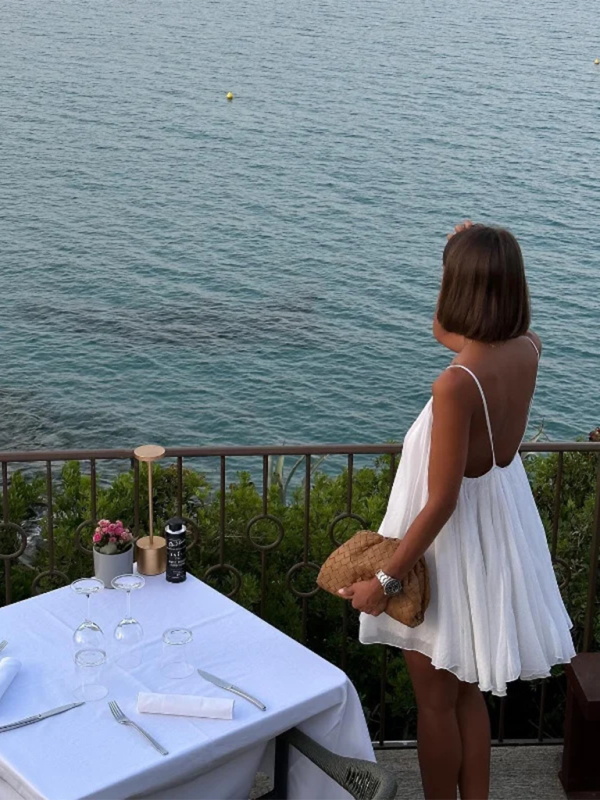 Robe bustier sexy pour femme, dos nu, col en V, ourlet plissé et volanté, sans manches.