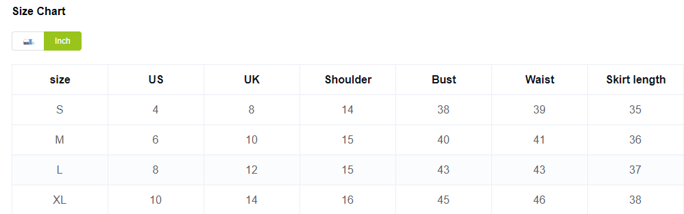 Size US UK Shoulder Bust Waist Skirt length S 4 8 14 38 39 35 M 6 10 15 40 41 36 L 8 12 15 43 43 37 XL 10 14 16 45 46 38